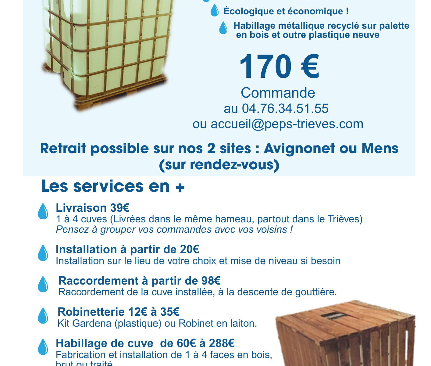 Nous proposons également les services suivants : Livraison, installation, raccordement aux gouttières… et même des caches-cuve en bois (traités à la brou de noix).